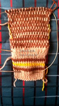 Останній ряд – коричневою пряжею всі петлі, при цьому прибираємо 1п через кожні 4-е петлі, щоб залишилося 27 петель. Переходимо на спиці № 3,5.