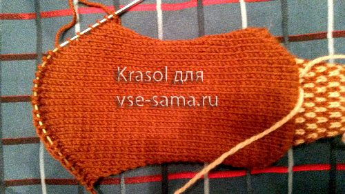3. Потім переходимо на в’язання задньої частини носка. Рівномірно додаємо в першому ряду