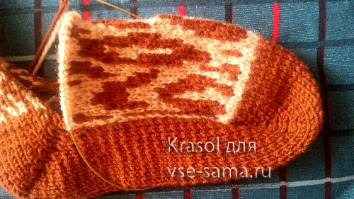 9. Передня частина халяви носка в’яжеться так само, як і підйом. В останньому особовому ряду 2 разом лицьовою остання петля ряду і петля кромочная задній частині халяви, в изнаночном рядку 2 разом в’яжуться виворітного. Так в’яжемо лицьовій гладдю до гумки.