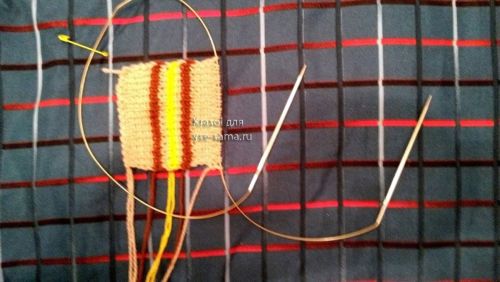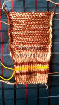 На вказівний палець лівої руки кладемо поруч дві нитки (коричневу і бежеву) і в’яжемо лицьовій ряд за схемою, захоплюючи то одну, то іншу нитку, при цьому, нитка захоплюється то зверху, то знизу, виходить вплітання нитки в полотно. У изнаночном ряду принцип той же. Дві нитки через спицю на вказівному пальці.