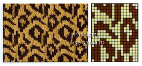 Лицьова гладь жакардовим візерунком: одна петля коричнева нитка, друга петля – бежева нитку і так далі поперемінно до кінця ряду. На виворітній стороні колір не змінюється. Над коричневим – коричневий, над бежевим – бежевий. В наступному особовому ряду колір змінюється: над коричневим – бежевий, над бежевим – коричневий.