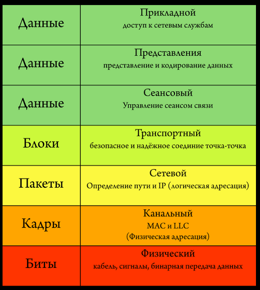 І ось тепер, коли у нас є хоча б загальне розуміння технології процесу, вважаю за необхідне розповісти про те, що таке біти, кадри, пакети, блоки і дані. Якщо пам’ятаєте, на початку статті я просив вас не звертати увагу на ліву колонку в основній таблиці. Отже, настав її час! Зараз ми пробіжимося знову по всім рівням моделі OSI і побачимо, як прості біти (нулі і одиниці) перетворюються в дані. Йти будемо так само знизу вгору, щоб не порушувати послідовності засвоєння матеріалу.