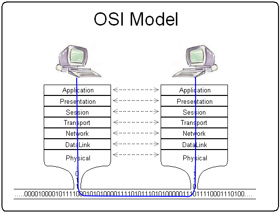 Щоб простежити шлях даних і відбуваються з ними зміни за рівнями, достатньо уявити, як вони рухаються вздовж синьої лінії на схемі, спочатку рухаючись зверху вниз по рівнях OSI від першого комп’ютера, потім знизу вгору до другого. Тепер більш детально розберемо кожний з рівнів.