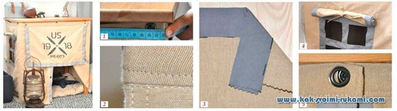Крізь інші люверси завдала (олівцем) підписи під інші шурупи. Вкрутила їх. Пришила гудзики до намету і пристібнула на них готову двері-клапан з малюнком.