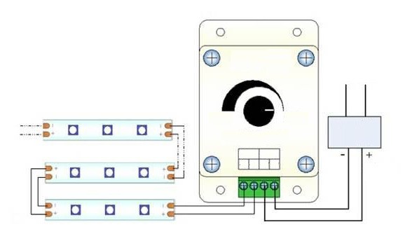 У схемі управління обов’язково беруть участь прилади, що обмежують електричний струм, роблячи його стабільним і відповідним за значенням підключеному приладу. Іноді для подібних цілей використовують потужні резистори. Але в цьому разі на ньому буде втрачатися даремно велика електрична потужність. Щоб схема працювала ефективно, необхідно при підключенні світлодіодної стрічки своїми руками використовувати низьковольтний джерело стабільного струму, яким і є диммер.