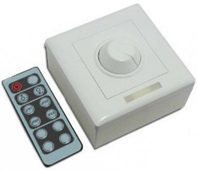 Диммер з пультом для світлодіодної стрічки дозволяє управляти яскравістю вироби на відстані. Це зручний спосіб, особливо в разі знаходження стрічки високо під стелею, на карнизі і т. д.