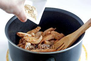 До злегка обсмаженої курки додати цибулю і часник. Смажити, при постійному помішуванні, на середньому вогні 2 хвилини.