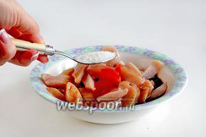 В соняшниковій олії обсмажити шматочки курки, обтрусивши їх від маринаду. Злегка посолити і додати сухий або свіжий імбир. Якщо беремо свіжий імбир, його можна натерти на тертці.