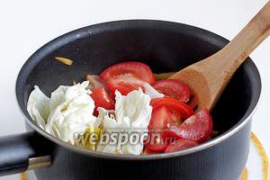 В останню чергу додати помідори і капусту. Потримати на вогні ще 1 хвилину. Якщо потрібно, злегка підсолити. Прибрати з вогню.