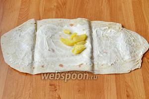 Лаваш змащуємо майонезом і викладаємо на нього картоплю.
