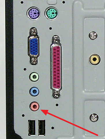 Для підключення мікрофона до комп’ютера використовується стандартний аудіо роз’єм під Mini Jack 3.5 mm. Даний роз’єм розміщується на задній стороні системного блоку. Поруч з роз’ємом для підключення мікрофону зазвичай знаходяться ще кілька подібних роз’ємів. Вони використовуються для підключення навушників і багатоканальної акустики. Для того щоб не переплутати роз’єми і підключити мікрофон туди куди потрібно, зверніть увагу на кольори, якими виділені роз’єми. Роз’єм для підключення мікрофона завжди позначено рожевим кольором. Також поруч з ним може бути нанесено зображення мікрофона.