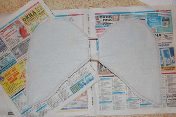 великі потрібно кріпити до нижньої частини крил, вставляючи в тканину кінчики пір’я,