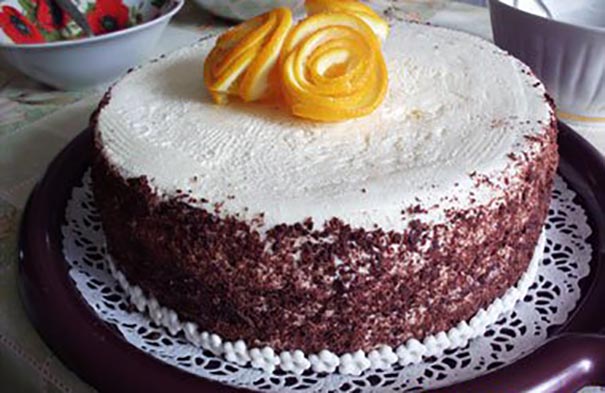 подачею на стіл нарізають порційними шматками. Тут використані апельсин,