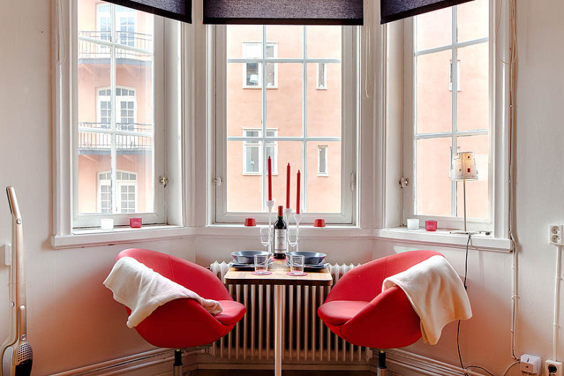Якщо в квартирі лоджія відсутня або вона занадто мала навіть для самого невеликого столу, але є еркер — столову групу слід розмістити в ньому. Прикрашайте вікно гарним текстилем, а стіл поставте на м’який килимок — так зона для прийомів їжі стане ще більш естетичною та затишною.