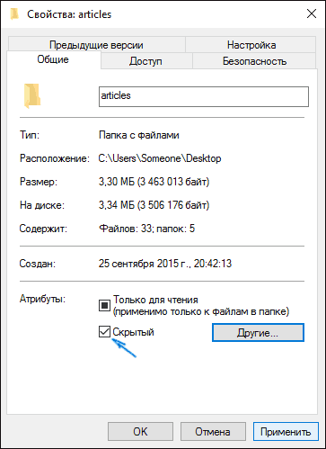 Якщо ж ви хочете приховати папку, не є прихованою в даний момент, то ви можете клацнути по ній правою кнопкою миші і встановити позначку «Прихований», після чого натиснути «Ок» (при цьому, щоб вона не відображалася, потрібно щоб показ таких папок був вимкнений).