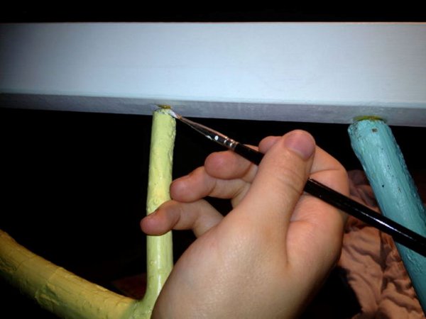 Почніть з фарбування окремих шматочків каркаса ліжка Fjellse. Для цієї роботи краще всього підходять синтетичні кисті. Не потрібно фарбувати всі частини з усіх боків, як показано на останній фотографії, тому що це не буде видно через матраца.