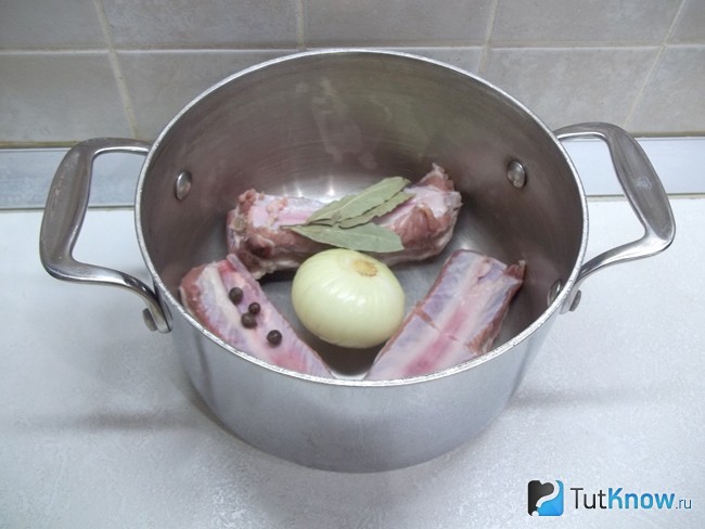 1. М’ясо (в даному рецепті свинячі реберця) помийте, наріжте шматочками і опустіть в каструлю. Додайте очищену головку цибулі, покладіть лавровий лист і перець горошком. Залийте продукти питною водою і поставте на вогонь варитися бульйон. Коли вода закипить, зніміть піну і зробіть мінімальний вогонь.