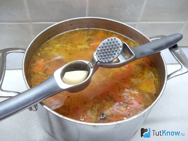 5. Часник очистіть від лушпиння, видавіть в каструлю і дайте прокипіти страви 1-2 хвилини.