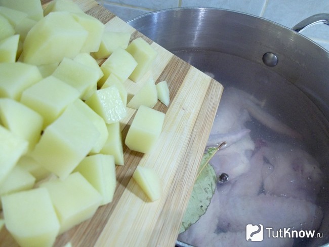 3. Поки вариться бульйон, очистіть, помийте і наріжте кубиками бульби картоплі.
