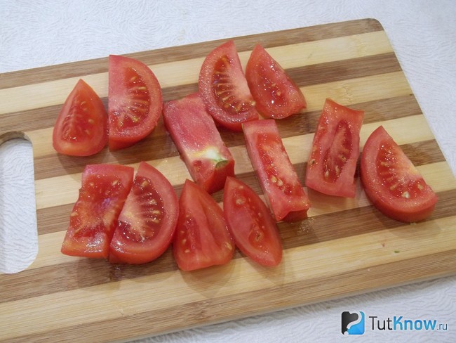 7. Помідор помийте і наріжте на 6-8 часточок.