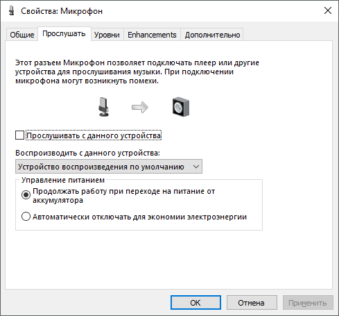 Наступна вкладка називається «Прослухати». Тут можна налаштувати перенаправлення звуку з мікрофона на динаміки. Для цього досить включити функцію «Прослуховувати з даного пристрою». Також тут можна налаштувати поведінку даної функції при роботі від акумулятора, що буде корисно, тільки якщо у вас ноутбук.
