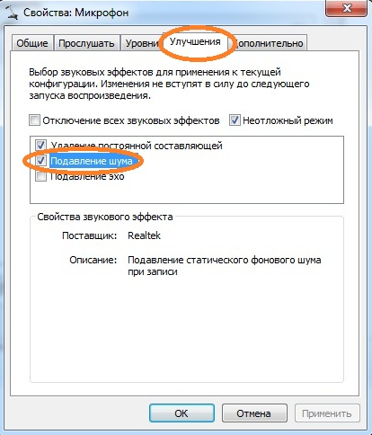 Але, зазвичай на вкладці «Покращення» доступні налаштування мікрофону, які відповідають за звукові ефекти і придушення шумів.