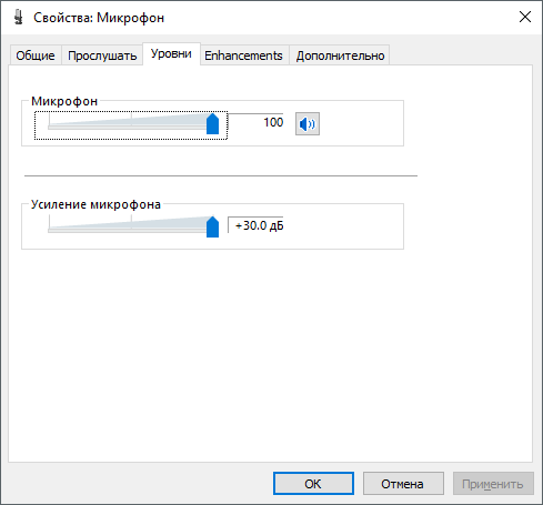 Наступна вкладка «Рівні». Тут знаходяться дві найбільш корисні налаштування мікрофону. Перша функція називається «Мікрофон» — це просто гучність мікрофона. У більшості випадків підійде значення 100. Друга функція «Посилення мікрофона» тут в більшості випадків підійде значення +20 дБ. Але, тут все більш індивідуально. Якщо ваш мікрофон записує звук занадто тихо, то сміливо встановлюйте +30 дБ, якщо ж навпаки мікрофон дуже чутливий і звук виходить дуже гучним, то рівень посилення мікрофона можна знизити до 10 дБ або навіть до нуля.