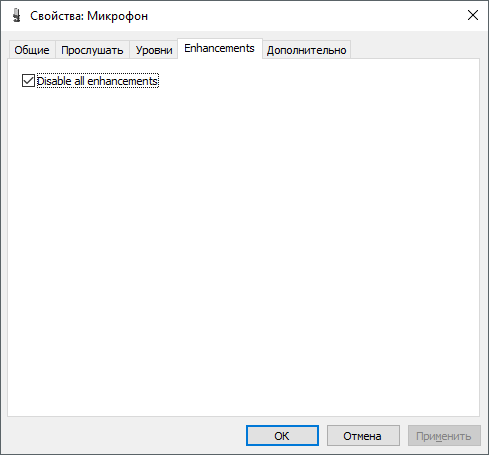 Наступна вкладка називається «Enchancements» або «Поліпшення». Налаштування, які доступні, залежать від моделі звукової карти і її драйвера. Наприклад, на моєму комп’ютері тут доступна тільки одна настройка «Відключити всі поліпшення».