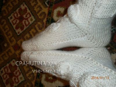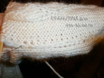 Тепер треба з’єднати верхню і нижню частини носка. Для цього я набирала з кромочной петлі нижньої частини носка петлю і провязывала її з останньою петлею на спиці. Вийшла ось така доріжка: