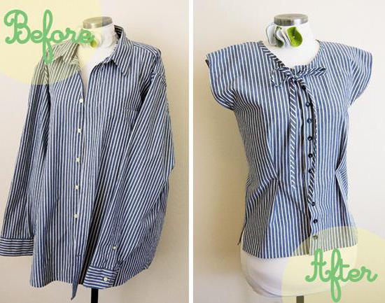 Перед тим як почнеться переробка з чоловічих сорочок, сорочку необхідно гарненько пропрасувати. Далі потрібно відрізати зайву довжину у сорочки. Після цього можна приступити до виготовлення планок. Краща їхня ширина – 4 сантиметри. Ідеально для них підходить габардин, який можна розкроювати у обидві сторони, економлячи матеріал. Щоб дізнатися, наскільки потрібно буде звузити сорочку, необхідно виміряти довжину плечового шва на ній і на власній блузці, до отриманої різниці між ними треба додати 4 сантиметри, так вийде ширина зайвої частини, яку треба прибрати. Наприклад, різниця склала 6 см, додаємо 4 см (це ширина планки), виходить 10 см потрібно прибрати. Для цього на передній частині потрібно відкласти смужку, ширина 10 см, необхідно відступити півтора см від глибокої точки пройми. На спинці при цьому треба продовжити малювати смужки з точок на плечових швах. Краще всього спочатку заколоти всі шпилькою і приміряти. Після примірки можна відрізати смужки, залишаючи припуск на 1 см, змітати з планками, прокладаючи рядки. Припуски швів потрібно загладити всередину. Після цього необхідно акуратно розпороти шви з боків на 5 см і підігнути бічні зрізи. Далі потрібно підігнути сорочку знизу і прострочити.
