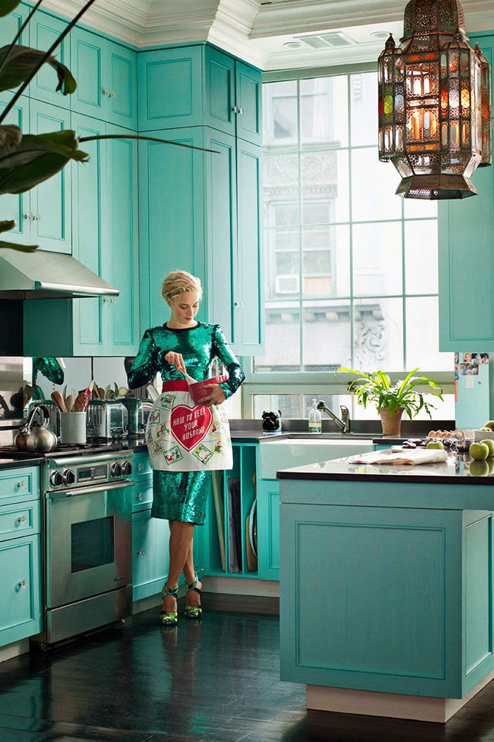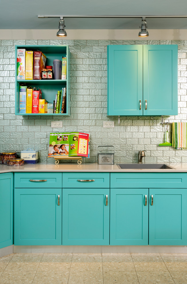 У тих, хто стоїть перед вибором кольору кухонних меблів або облицювальних матеріалів для цього приміщення, є відмінна можливість зробити ставку на колір Тіффані для шаф, захисного фартуха або плиткової підлоги. Тому як, в оточенні не стандартних об’єктів і незвичних відтінків досить часто виникає потреба творити так само сміливо і по-новому, навіть якщо це відноситься до приготування їжі.