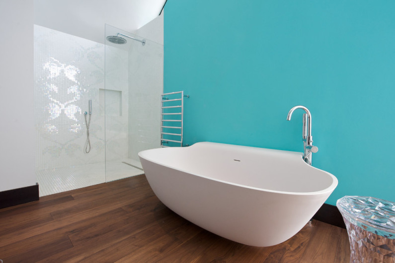 Природною областю застосування бірюзового Тіффані є ванна кімната, тому як, даний відтінок асоціюється з водою і морською стихією. Вранці остаточно прокинутися вам допоможе контрастний душ, але і пронизливий колір на стінах, плитці або в якості банного приладдя.
