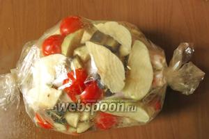 Інгредієнти: курка, помідори невеликі, баклажани середні, айва, олія, мед, вустерський соус, сіль, перець мелений.