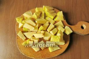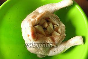 Залишилася половинку айви нарізаємо пластинками і кладемо їх на курку.