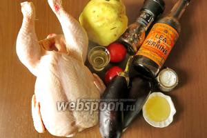 Айва 1 шт.Баклажани сині 3 шт.Курка ціла 1600 гОлія оливкова рафінована 55 млМед 70 млПерець чорний мелений – 5 гПомідори 12 гСіль 15 гСоус Вустерський 15 мл