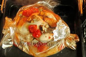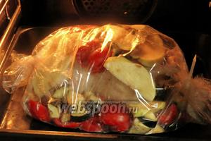 Зменшуємо нагрів до 170°С, розкриваємо рукав, поливаємо соком курку, програмуємо нагрівання-конвекцію. Через 10 хвилин прикриваємо лапки, ще раз поливаємо соком, смажимо ще 20 хвилин.