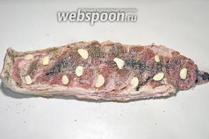 Подчеревену моєму проточною водою, прибираємо серветками зайву вологу, натираємо сіллю, перцем і прованськими травами з обох сторін. Часник чистимо, нарізаємо пластинами і викладаємо зверху.