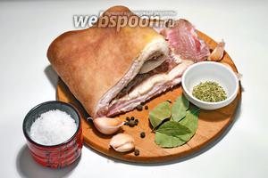 Лавровий лист 3 шт.Перець запашний 4 шт.Перець чорний горошком 3 шт.Перець чорний мелений 0.5 ч. л.Прованські трави 1 ст. л.Свиняча підчеревина 1500 гСіль морська 2 ст. л.Часник 1 голівка