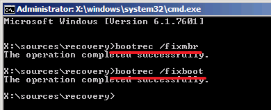 Після чого введіть в неї команди «команду bootrec /fixmbr» і «команду bootrec /fixboot»