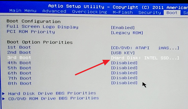 Після цього потрібно звернути увагу на загальний список пристроїв, що використовуються для завантаження операційної системи. У цьому списку також повинен бути жорсткий диск з операційною системою.