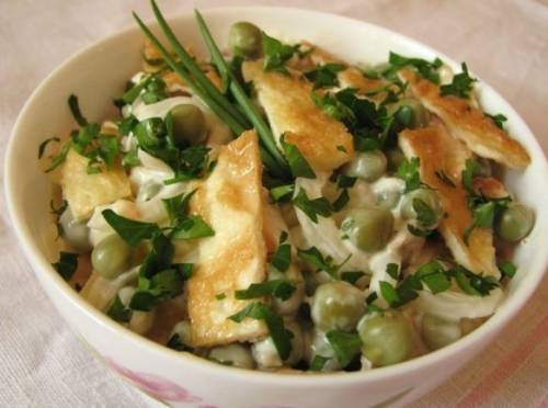 Варіантів приготування салатів з омлетом існує багато, а ми в цьому рецепті ми розповімо про один з найбільш смачних. Це ситний салат, для якого, крім омлету використовуються відварна курка, зелений горошок, свіжа зелень і цибулю. Такий салат з омлетом сподобається вам і вашим близьким.