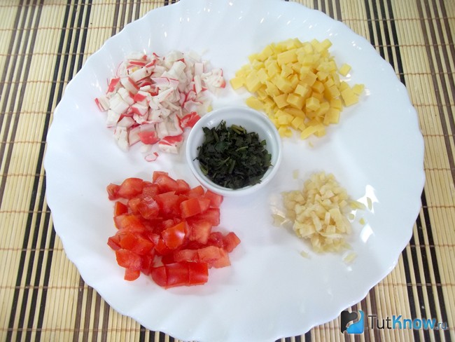 2. Підготуйте начинку для омлету. Крабові палички наріжте кубиками розміром близько 5 мм. Сир натріть на тертці або наріжте. Помідор вимити, висушити і наріжте як попередні продукти. Часник очистіть і подрібніть. Зелень вимити і накришити. У даному рецепті зелень використовується заморожена. Ви теж можете застосовувати таку ж.