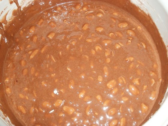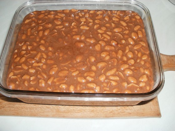 4. Після того, як суміш стане однорідної консистенції, вимикаємо вогонь і додаємо туди смажений арахіс. Можна купити готовий або ж посмажити будинку. Для цього сирі горішки необхідно висипати на суху чисту сковорідку і смажити на маленькому вогні приблизно 15 хвилин, не забуваючи при цьому весь час помішувати. Готовність можна перевірити за лушпинні – коли вона висохла і легко тріскається, це говорить про те, що він готовий.