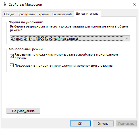 Остання вкладка параметрів мікрофона на Windows 7 називається «Додатково». Тут можна змінити налаштування розрядності і частоти дискретизації, а також тут можна змінити налаштування монопольного режиму роботи мікрофона. Якщо ви не знаєте, які налаштування розрядності і частоти дискретизації вам потрібні, то просто натисніть на кнопку «За замовчуванням».