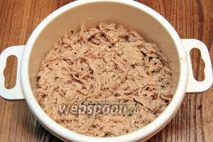 М’ясо подрібнити в блендаре або розділити на волокна.