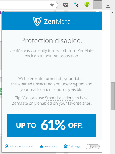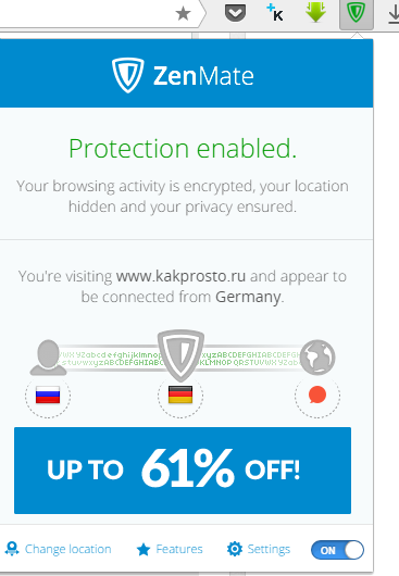 3. Встановити додаток, натиснувши кнопку установки. Тепер у браузері іконка у вигляді щита, при натисканні на яку випадає вікно керування додатком. У самому нижньому правому куті є перемикач додатки (On/Off, що російською означає Вкл/Викл). Слід включати додаток тільки коли потрібно зайти на заблокований сайт, інакше буде сильно навантажувати браузер.