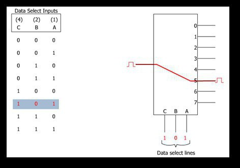 Під мультиплексором розуміють пристрій, який вибирає один з кількох входів, а потім підключає до свого виходу. Все залежить від стану двійкового коду. Мультиплексор використовується як перемикач сигналів, який має кілька входів і один вихід. Механізм його роботи можна описати такою таблицею: