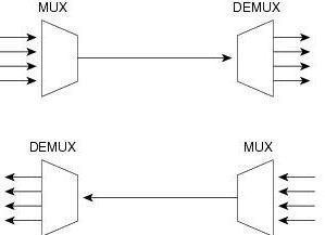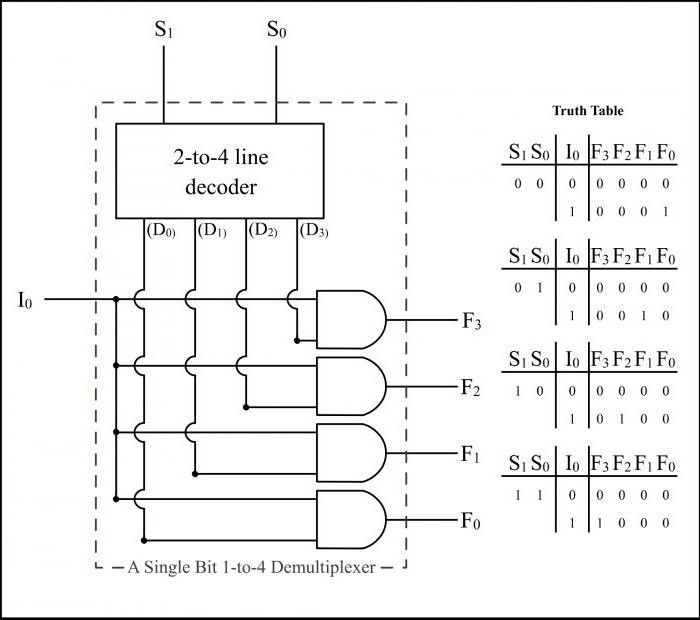 Під демультиплексором розуміють пристрій з одним входом та безліччю виходів. Що до чого буде підключатися – визначає двійковий код. Для цього він зчитується, і вихід, який має необхідне значення, підключається до входу. Як бачите, дані пристрої не обов’язково повинні діяти в парі для повноцінної роботи, а свою назву одержали за виконуваного функціоналу.