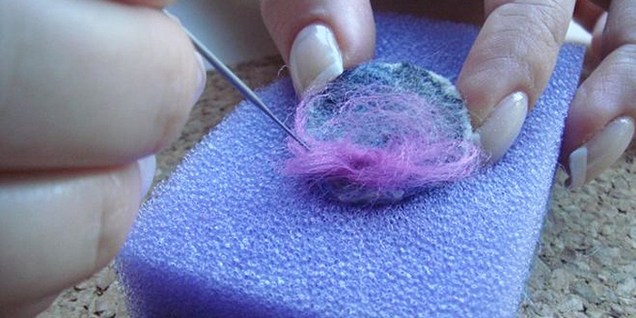 1. Матеріал накладаємо на поролон, спутываем за допомогою голки. Основу вироби іноді виготовляють з синтепону, покриваючи її зверху шерстю.