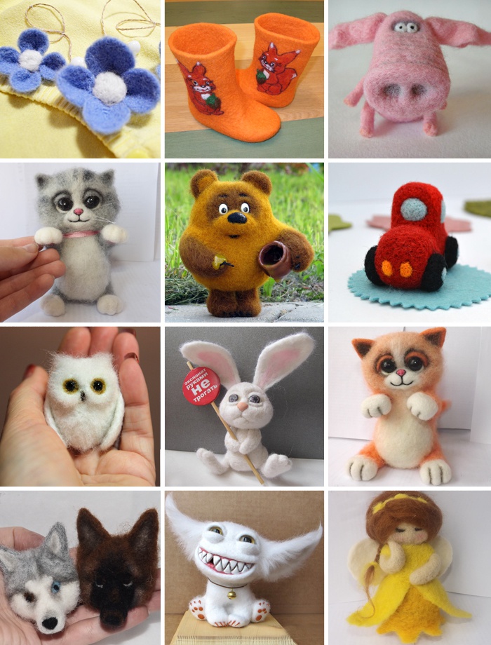 Рукодільниці-новачки та майстрині зі стажем часто публікують фотографії своїх робіт, виконані за методикою фелтінг. Зверніть увагу на фото авторських оригінальних і красивих виробів. Можливо, вони стануть головним поштовхом, щоб спробувати себе в цьому типі творчості. Будуть прикладом, ідеєю того, як повинна виглядати правильно сваляная робота. Тут ви побачите ляльок, тварин, прикраси і т. д.